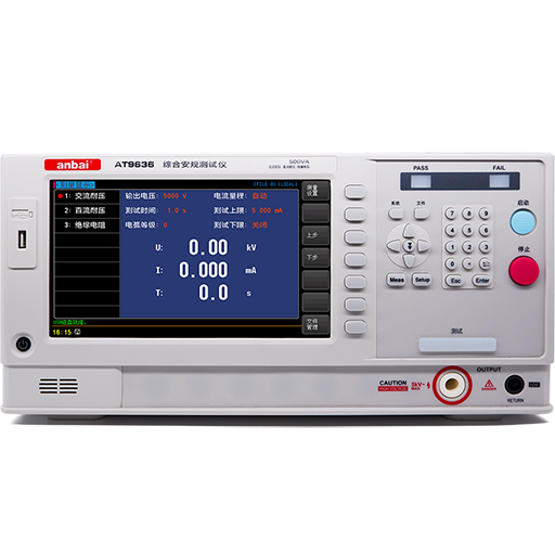 AT9636 電氣安全性能綜合分析儀是集電氣強度(交/直流耐壓)、絕緣電阻多項測試功能于一體的儀器,額定輸出5kV100mA輸出容量500VA,是各電器生產廠家和質檢部門重要的檢測設備。