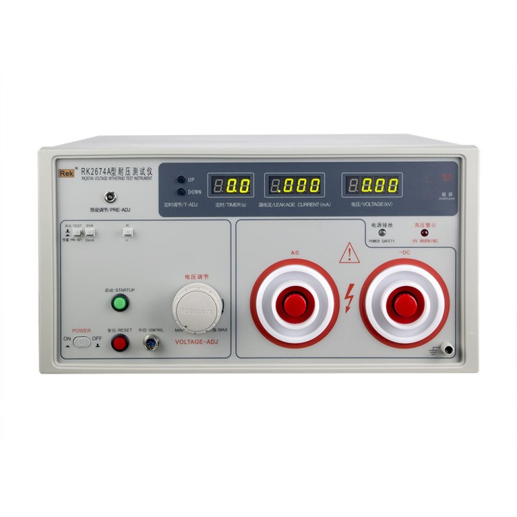 美瑞克RK2674系列耐壓測試儀是測量耐壓強度的儀器,可以直觀、準確、快速地測試各種被測對象的擊穿電壓、漏電流等電氣安全性能指標,并可以作為高壓源用來測試元器件和整機性能。