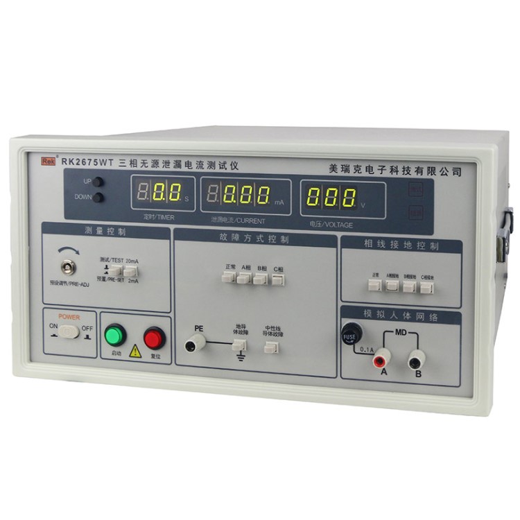 RK2675WT三相泄漏電流測試儀用于測量電器的工作電源(或其他電源)通過絕緣或分布參數阻抗產生的與工作無關的泄漏電流,是衡量電器絕緣性好壞以及產品安全性能的檢測實驗設備。