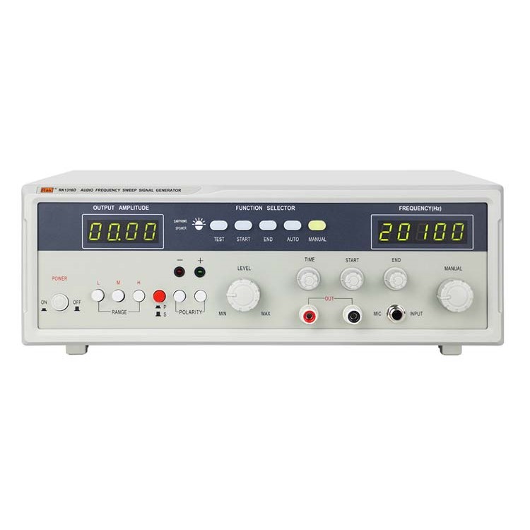 RK1316系列音頻信號發生器采用先進的壓控振蕩電路,產生穩定、低失真的正弦波信號。輸出幅度、頻率均采用數碼顯示、掃頻范圍可達1:1000以上,掃頻的起點和終點可任意設置,具有開機延時輸出、短路保護等功能,同時還設計測試任何型式、尺寸、阻抗之揚聲器、耳機、動圈受話器的“正”“負”極性的功能。
